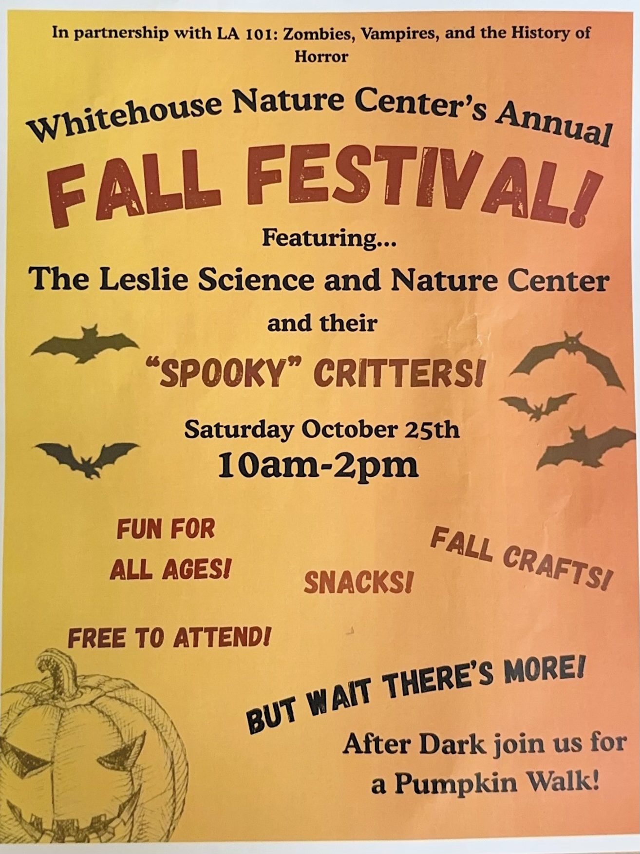 Autumn is in full swing, and Whitehouse Nature Center is celebrating with a free Fall Festival on October 25 from 10 a.m. to 2 p.m. This family-friendly event will feature pumpkin carving, fall crafts, festive snacks, and a special presentation from the Leslie Science & Nature Center – bringing along live bats and other “spooky critters” for guests to meet.