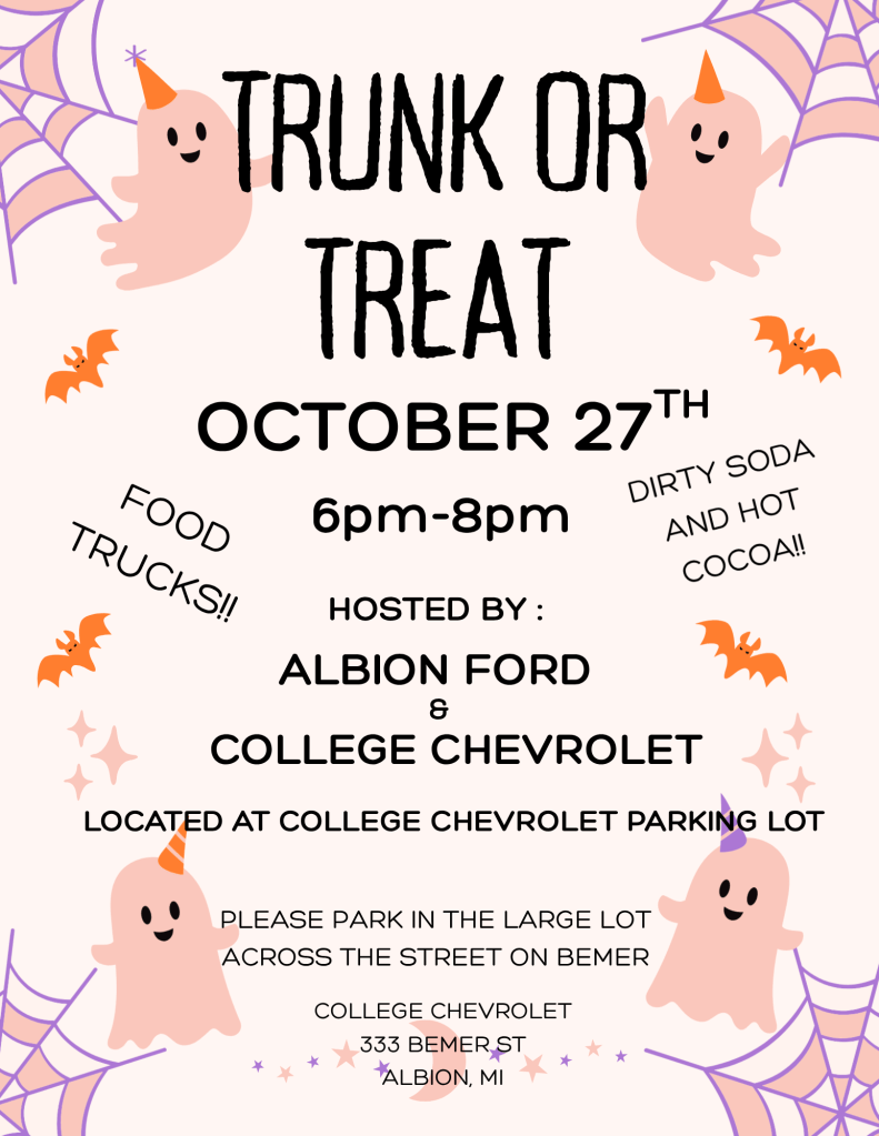 Halloween is right around the corner, and College Chevrolet and Albion Ford are kicking off the festivities with a Trunk-or-Treat event on Sunday, October 27th from 6–8 PM in the College Chevrolet parking lot at 333 Bemer Street.