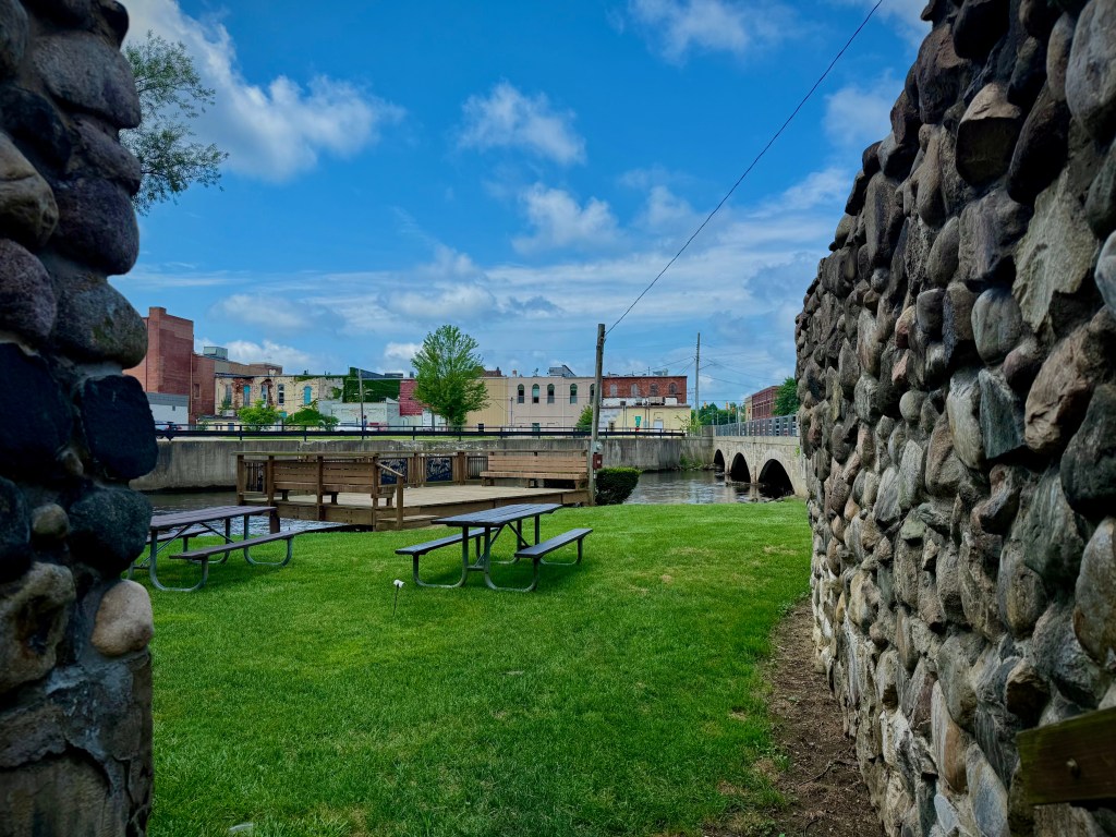 Nestled in the heart of downtown Albion, Bournelis Park offers a seating area with a great view of both the Kalamazoo River and Albion’s beautiful Coca-Cola mural.