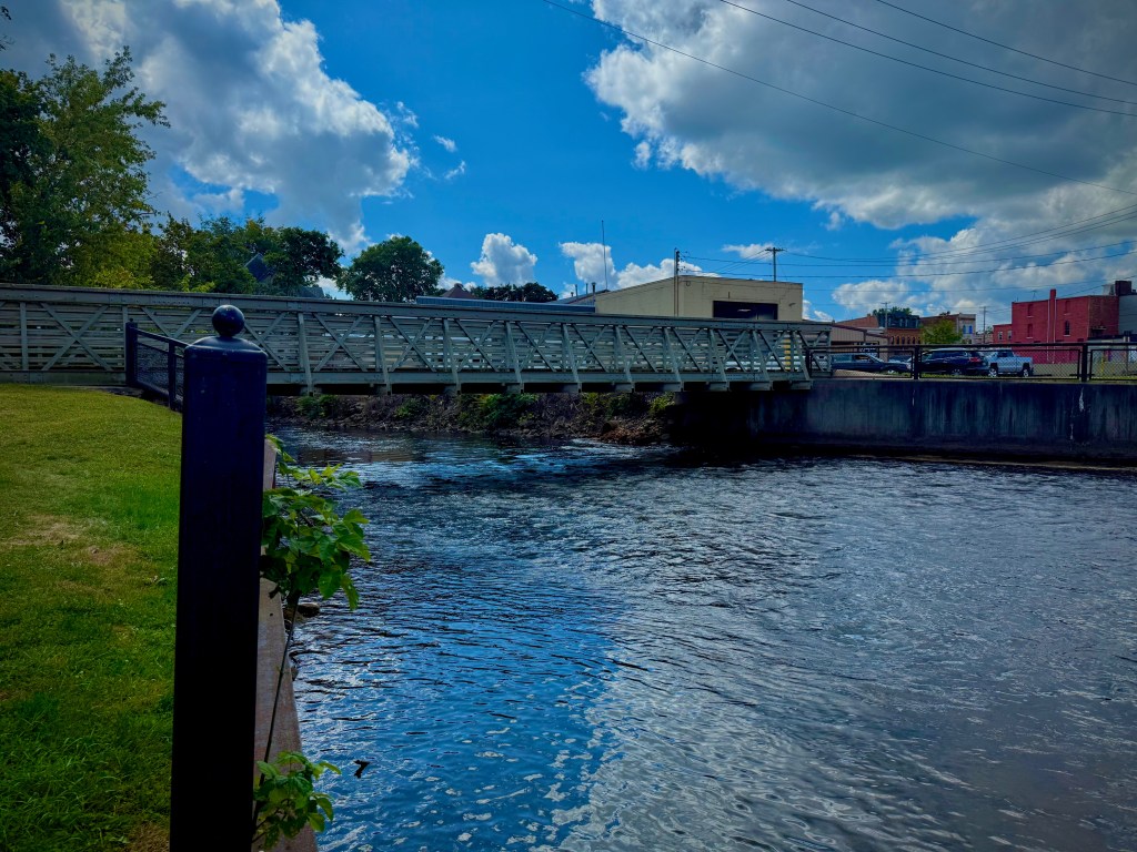 A small canoe launch site. Just downstream, the river runs under downtown Albion and is about 12.6 miles from Stuart’s Landing.